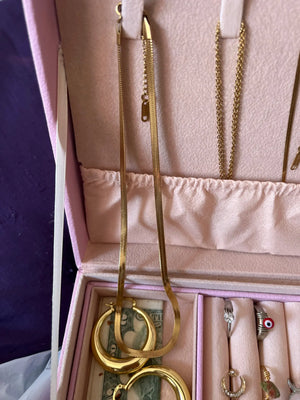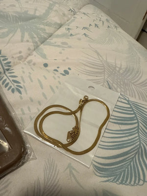 Liquid gold, layered with intention. The Serene Layer pairs a sleek herringbone chain with a whisper-thin strand, effortless and refined, designed to rest against the skin like a second light. Understated yet unmistakable, it’s the kind of piece that completes everything without trying.